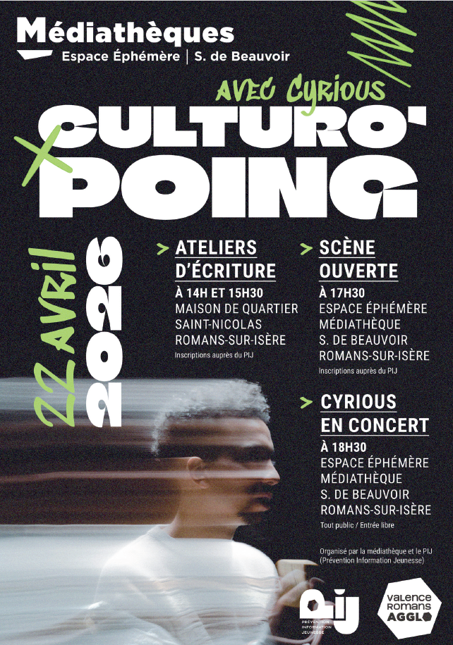 L’équipe du PIJ du Romans organise, en collaboration avec la médiathèque Simone de Beauvoir à ROMANS-SUR-ISERE, dans le cadre de nos mercredi du PIJ, un après-midi spéciale hip hop/ rap le 22 avril 2026.